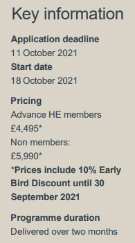 تاریخ شروع دوره: 18 اکتبر 2021 (26 مهر 1400) مهلت ثبت نام: 11 اکتبر 2021 (19 مهر 1400) هزینه ثبت نام: برای اعضا 4,495 پوند، برای افراد عادی 5,990 پوند محل برگزاری: مجازی آدرس سایت جهت کسب اطلاعات بیشتر www.advance-he.ac.uk/slp جهت مشاهده ماژول ها و برنامه زمانی کلیک نمایید