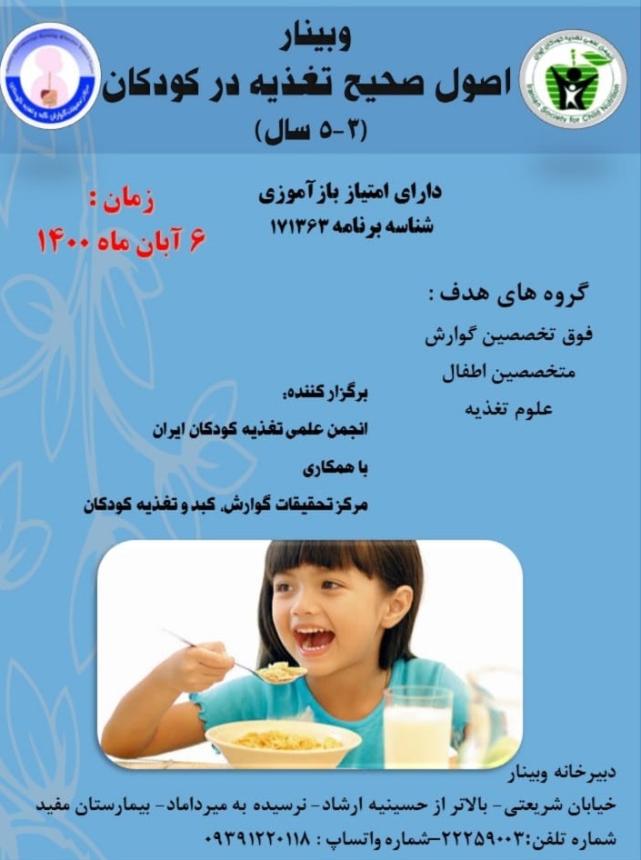 به استحضار می رساند «وبینار اصول تغذیه صحیح در کودکان (3تا5سال)» با شناسه برنامه 171363 در تاریخ ششم آبان ماه 1400 برگزار می گردد. گروههای هدف شامل متخصصین کودکان، فوق تخصصین گوارش، کارشناسان و کارشناسان ارشد و دکتری تغذیه می باشد. با عنایت به اینکه ظرفیت برنامه محدود می باشد تقاضا دارد نسبت ثبت نام خود در سامانه آموزش مداوم به آدرس www.ircme.ir اقدام فرمایید. |