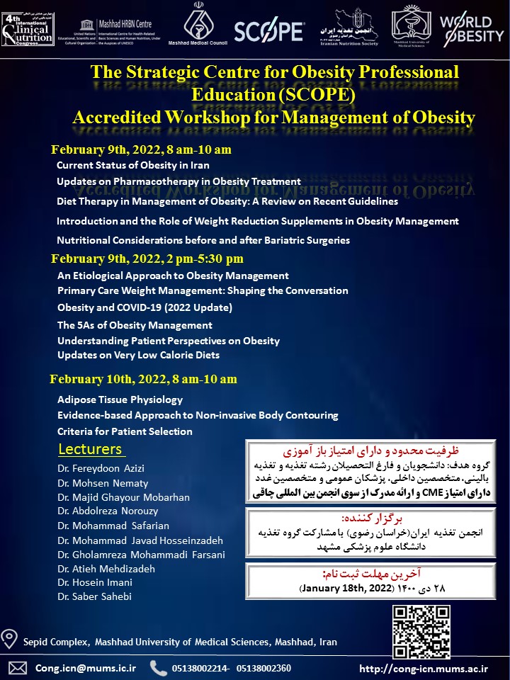 - عنوان کارگاه: The Strategic Centre for Obesity Professional Education (SCOPE) Accredited Workshop for Management of Obesity - زمان: 18-19 بهمن ماه 1400(7-8 February 2022) - دارای امتیاز CME و ارائه مدرک از سوی انجمن بین المللی چاقی - ظرفیت محدود و دارای امتیاز باز آموز - گروه هدف: دانشجویان و فارغ التحصیلان رشته تغذیه و تغذیه بالینی، متخصصین داخلی، پزشکان عمومی و متخصصین غدد - آخرین مهلت ثبت نام: 28 دی 1400 (January 18th, 2022) - آدرس سایت: http://cong-icn.mums.ac.ir/fa/page.php?rid=59