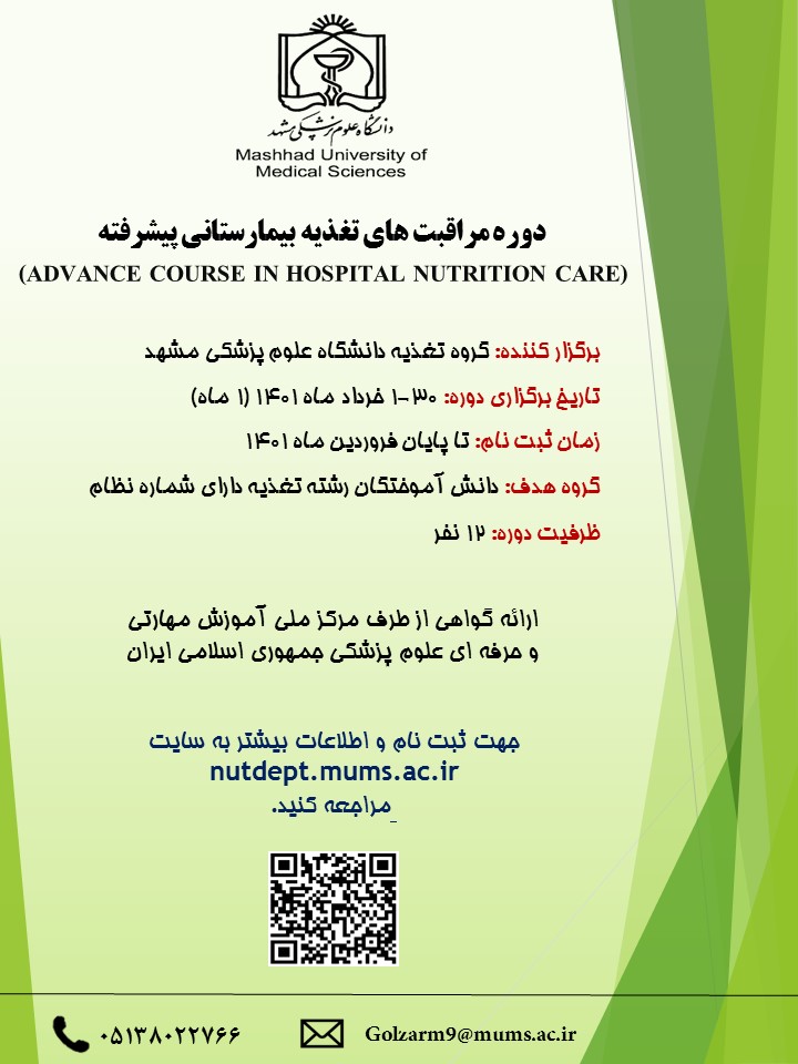 این دوره برای کارشناسان تغذیه، کارشناسان ارشد تغذیه، دکترای تخصصی تغذیه که تمایل دارند در زمینه مراقبت های تغذیه بیمارستانی فعالیت داشته باشند طراحي شده و شامل 40 ساعت آموزش تئوری و 110 ساعت دوره بیمارستانی خواهد بود. طول مدت دوره: يك ماه تاريخ برگزاري دوره: يكم تا 30 ام خردادماه 1401 ظرفيت دوره: 12 نفر مسئول دوره: خانم دكتر مريم علي نژاد كارشناس دوره: خانم مريم گلذار هزينه دوره: پنج ميليون و پانصدهزارتومان با توجه به محدوديت ظرفيت، متقاضيان شركت در دوره لطفا حداكثر تا پايان فروردین ماه 1401 مشخصات خود شامل: نام و نام خانوادگي، شماره تماس، آدرس ايميل، مقطع تحصيلي و دانشگاه محل تحصيل را به ايميل این آدرس ایمیل توسط spambots حفاظت می شود. برای دیدن شما نیاز به جاوا اسکریپت دارید ارسال كنيد. جهت پاسخگويي به سوالات با شماره تماس 05138022766 و آدرس ايميل ذكرشده در تماس باشيد. |